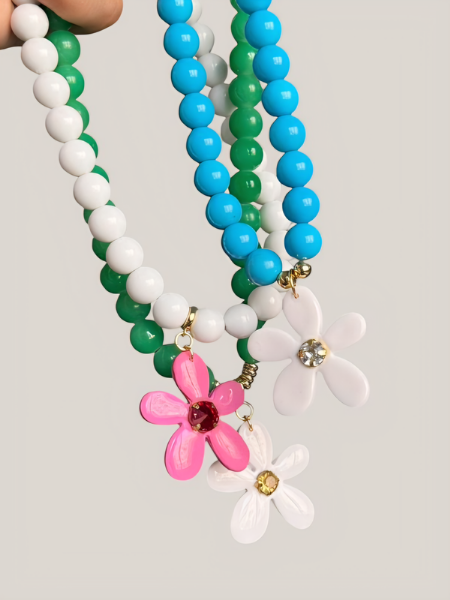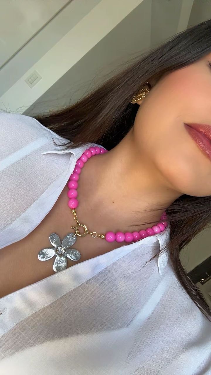 Collar elaborado con cuentas redondas de acrílico que aportan un acabado ligero y moderno. En el centro destaca un dije de flor hecho a mano en arcilla polimérica, diseñado con delicadeza para añadir un toque especial y artesanal a la pieza. Los herrajes son de acero inoxidable, lo que garantiza mayor durabilidad y resistencia al uso diario. Es un accesorio versátil y fácil de combinar, ideal para complementar tus looks de forma sutil y elegante.
