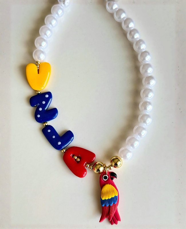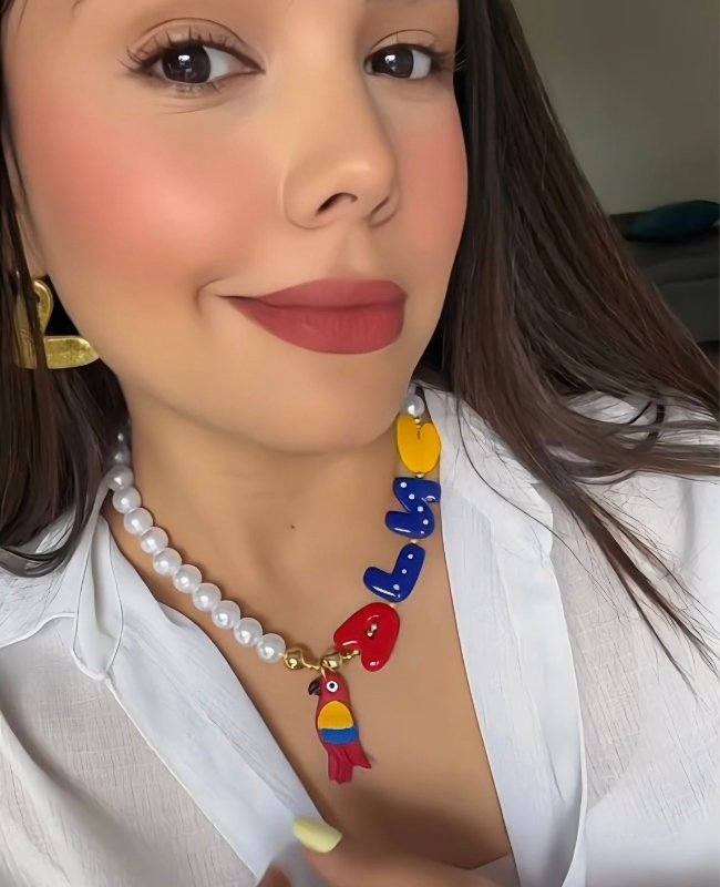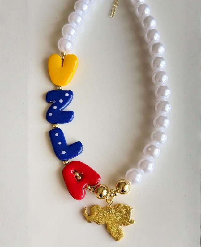 Collar con letras VZLA, una forma especial de llevar siempre cerca a Venezuela. Las letras están hechas a mano en arcilla polimérica, cuidadosamente moldeadas para crear una pieza única y llena de significado. Las cuentas aportan un toque moderno y ligero